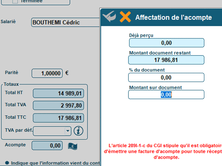 Il faut alors saisir le montant de l’acompte ainsi que le taux de TVA. Si par erreur, vous saisissez un mauvais montant pour l’acompte ou un taux de TVA incorrecte, vous constatez qu’il n’est pas possible de modifier la facture d’acompte générée automatiquement.