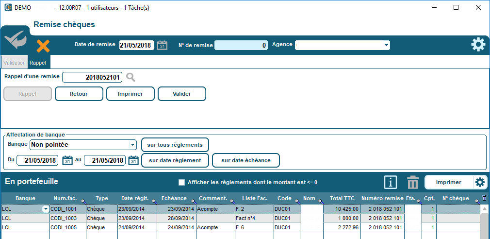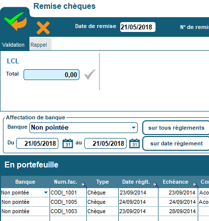Les règlements seront de nouveaux accessibles dans l’onglet « VALIDATION » de la remise en banque.