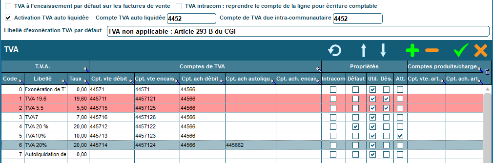 Les taux de TVA sont réglés dans les paramètres du logiciels Codial. Vous pouvez déclarer autant de taux de TVA que souhaité. Dans le cas des achats en autoliquidation, le compte Achat Autoliquidé doit être spécifié.