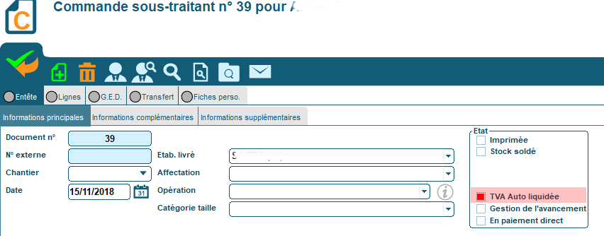 Dans les documents d’achat, il sera nécessaire de cocher la case « TVA Auto Liquidée » lorsque vous achetez de la sous-traitance. La case ne se coche pas automatiquement même si le fournisseur est déclaré en tant que sous-traitant.