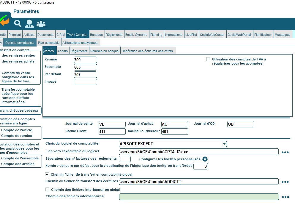 Concernant les règlements, vous pouvez faire le choix d’enregistrer des remises en banque ou de constituer le fichier de transfert sans remise en banque. Le choix de la remise est réalisée dans les paramètres de Codial (« Paramètres » / « TVA/Compta » / « option comptable ») et repose sur chaque mode de règlement.