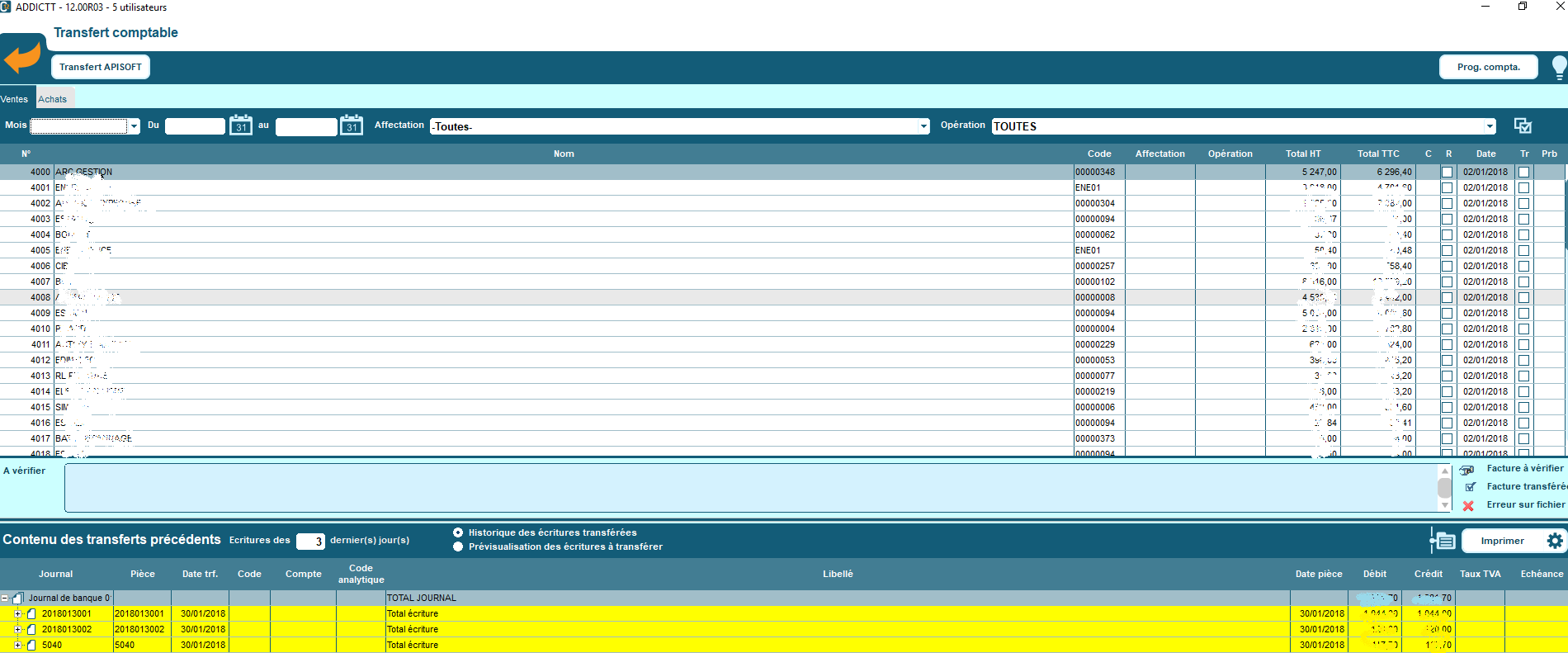 Vous pouvez sélectionner les factures d’achat et de vente que vous souhaitez transférer en comptabilité. Le transfert est réalisé en cliquant en suite sur le bouton correspondant au nom du logiciel défini dans les paramètres de l’ERP CODIAL.