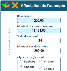 Pour annuler un acompte, il faut saisir un acompte négatif. Il conviendra ensuite de pointer l’acompte positif et l’acompte négatif dans la partie règlement.