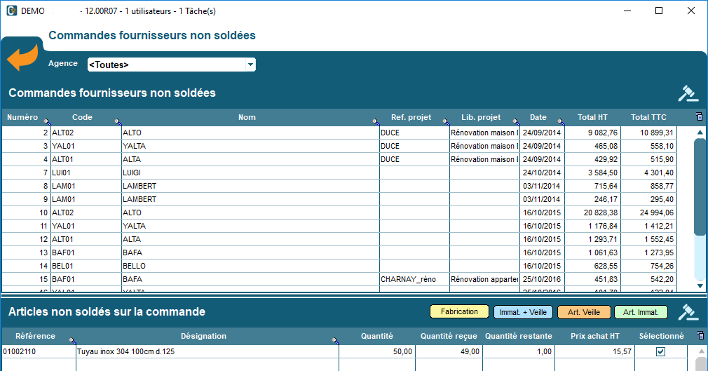 Pour solder une commande (ou une ligne de commande) d’un fournisseur, il est nécessaire de passer par le menu OUTILS dans la liste des Commandes fournisseurs.