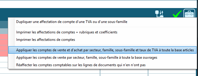 Si vous souhaitez changer en masse les comptes comptables dans CODIAL, plusieurs outils sont à votre dispositions dans l’onglet « Articles » / « Comptes », vous pouvez réappliquer les comptes des familles / sous-familles sur les articles.