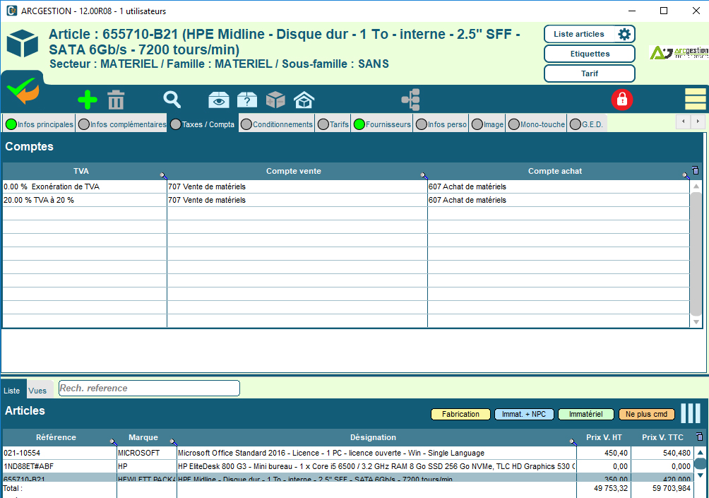 3- Dans une fiche Article, l’onglet « Taxes/Compta » est l’emplacement pour spécifier un compte comptable de vente ou d’achat par taux de TVA. Ces comptes sont appliqués prioritairement.