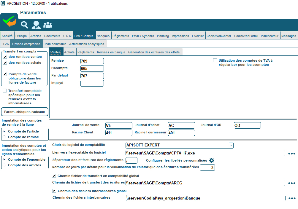 Vous y trouverez le compte de vente et d’achat par défaut, le compte de remise, le compte d’escompte,… ainsi que les journaux d’achat, de vente, d’opérations diverses,… pour vos transferts en comptabilité.