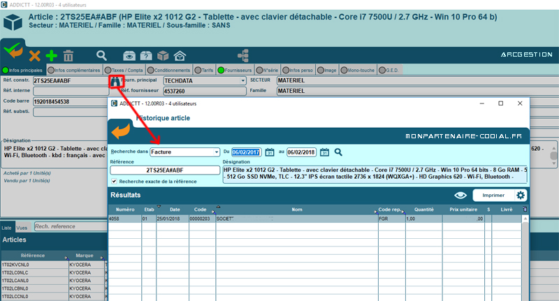 Depuis la fiche article, vous pouvez consulter, sur une période donnée, les documents commerciaux de vente dans lesquels le produit se trouve.