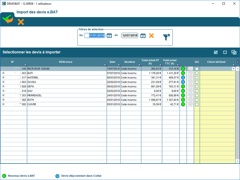 - Choisir le client de votre base CODIAL dans la colonne « Code attribué » pour associer le devis e.bat à un client de votre fichier.