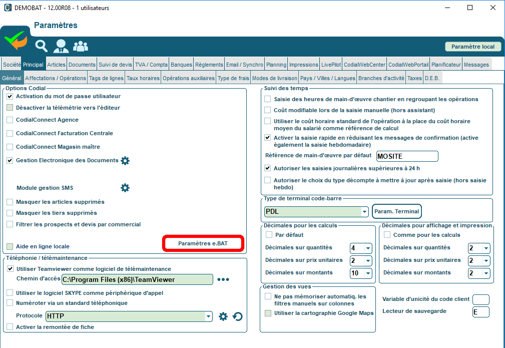Dans les paramètres de Codial, le bouton « Paramètres e.BAT » apparait au niveau de l’onglet « Principal » / « Général ».