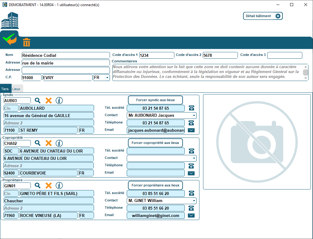 Ce module Syndic/Copro stocke les informations sur les différents tiers intervenants: Syndic, Copropriété, Propriétaire, Locataire et également sur l’emplacement des équipements sous contrat: partie commune, partie privative, partie commerciale,…
