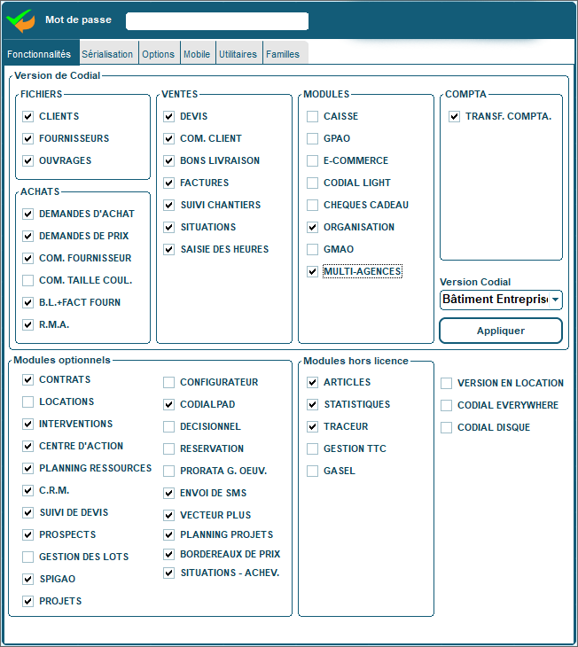 C’est la clé de licence Codial qui coche ou décoche les cases des fonctionnalités.