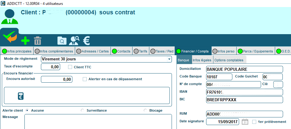Pour réaliser des prélèvements bancaires sur le compte d’un client, il est indispensable de renseigner ses coordonnées bancaires dans sa fiche. Le mandat de prélèvement doit avoir un RUM (Référence Unique de Mandat) qui est attribué par votre société.