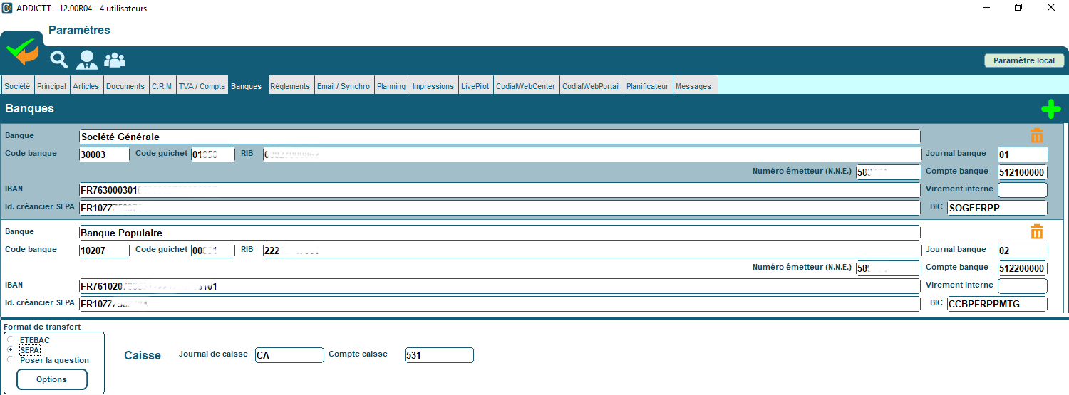 Il est nécessaire de paramétrer le ou les banques dans les paramètres de Codial en indiquant toutes les informations bancaires et votre numéro d’émetteur.