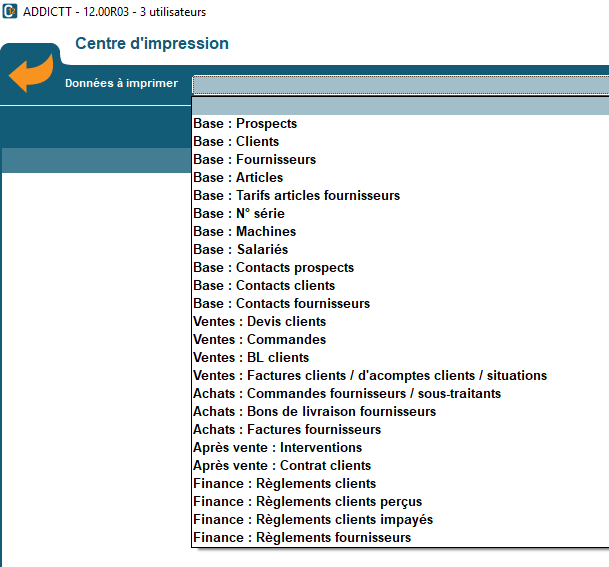 Selon les modules disponibles dans votre logiciel, la liste des données disponibles dans le centre d’impression varie.