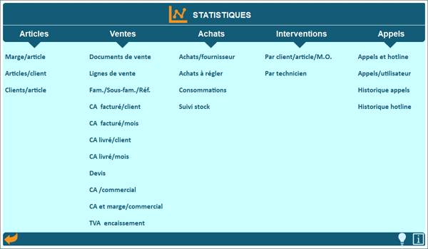 L’accès à l’information sous forme de statistique, tableau de bord, reporting, export,… est possible selon différents modes accessibles depuis le menu OUTILS ou via le LivePilot.