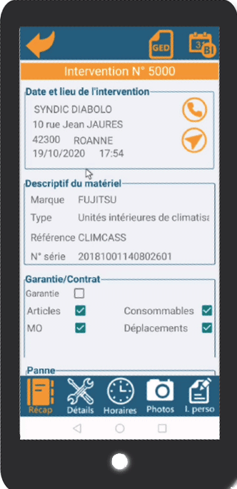 - La rédaction du rapport d'intervention avec la prise de photos. Le rapport d'intervention peut être dicté par l'intermédiaire des fonctions du téléphone. Les photos seront enregistrées dans la GED du bon d'intervention