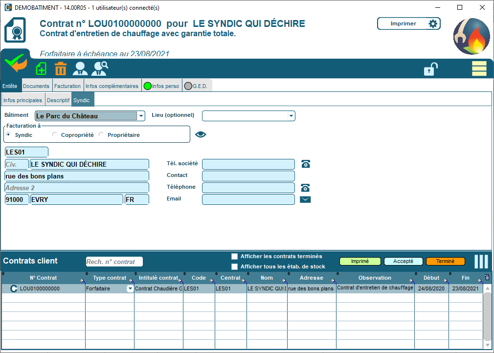 Au niveau des contrats, il est possible de faire un contrat « Syndics ». L’association des contrats à un lieu permet de facturer le bon tiers (propriétaire, locataire, copro).