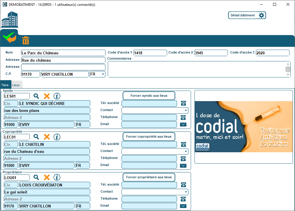 - Un syndic: tiers client avec les coordonnées du syndic